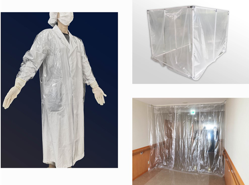 『院内スタッフはビニール袋をかぶって対応に追われている・・・』 とある病院関係者から知らせを聞き私たちにもできることはないかと当日中から社員総出で試行錯誤を繰り返し、医療機器用カバーで培ったノウハ ウを活かしたポリエチレン製の長袖の個人防護衣の製作を行いました。